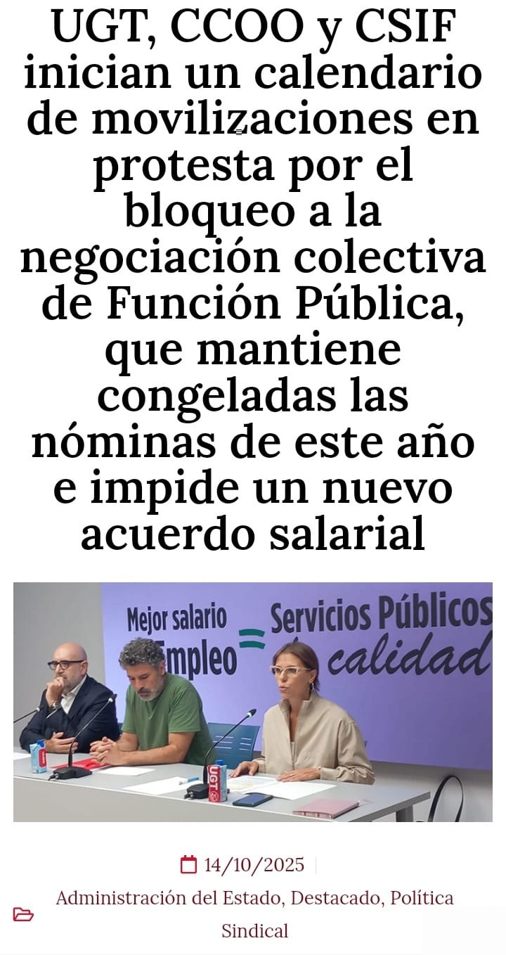 Bajo el lema “Negociación, subida salarial y mejora de los servicios públicos”, las movilizaciones comenzarán el próximo 30 de octubre con concentraciones frente a las subdelegaciones de Gobierno de toda España y al Ministerio de Función Pública en Madrid, y continuarán con una gran concentración en noviembre en Madrid si el departamento que dirige Óscar López continúa bloqueando la negociación. En el caso de que Función Pública persista en esta actitud, las tres organizaciones sindicales convocarán una jornada de huelga a nivel nacional el próximo mes de diciembre.