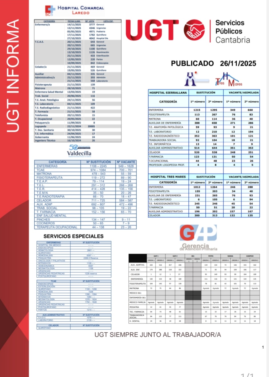 #UGT os informamos de los próximos números a los que corresponden ser llamados cuando surja la necesidad de contratación de Personal Estatutario Temporal en los diferentes centros del Servicio Cántabro de Salud